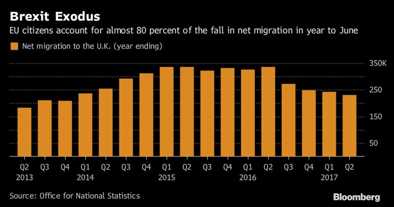 - Η καθαρή μετανάστευση στο Ηνωμένο Βασίλειο μειώθηκε κατά 106.000 ρεκόρ το χρόνο μετά το δημοψήφισμα της Brexit, καθώς οι υπήκοοι της Ευρωπαϊκής Ένωσης έφτασαν σε λιγότερους αριθμούς, μια τάση που χαιρέτισαν ορισμένοι νομοθέτες και αποδοκίμασαν οι επιχειρήσεις.Οι συνολικές αφίξεις ξεπέρασαν τις 230.000 αναχωρήσεις κατά τους 12 μήνες έως τον Ιούνιο, το χαμηλότερο ποσοστό από το τέλος του 2013, σύμφωνα με το Γραφείο Εθνικών Στατιστικών του Λονδίνου. Η καθαρή μετανάστευση ανήλθε σε ρεκόρ 336.000 το χρόνο πριν από το δημοψήφισμα.